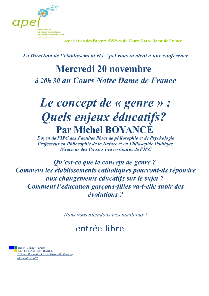 dans le cadre de la commission « PASTORALE » et de l‘information des parents sur la théorie du GENDER, deux conférences sont proposées la semaine prochaine par Michel BOYANCE (Doyen des Facultés Libres de Philosophie et de Psychologie de Paris) :