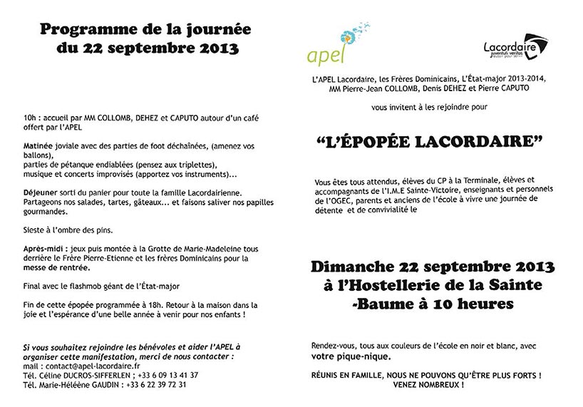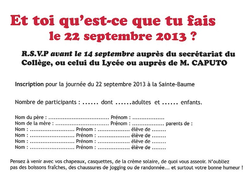 merci aux 247 personnes qui ont déjà répondu à notre invitation conjointe avec l’école et les frères Dominicains pour la journée du 22 septembre. Merci à vous de nous renvoyer rapidement votre bulletin d’inscription afin que l’APEL puisse vous accueillir au mieux à la Sainte Baume.